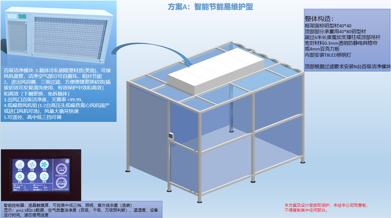 模塊化組裝,支持移動(可選萬向輪)、擴(kuò)展或調(diào)整潔凈級別(百級至十萬級)。