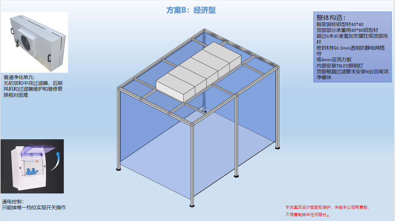 圍擋:防靜電軟簾(0.3–0.5mm厚網(wǎng)格)或亞克力板,透光防塵。